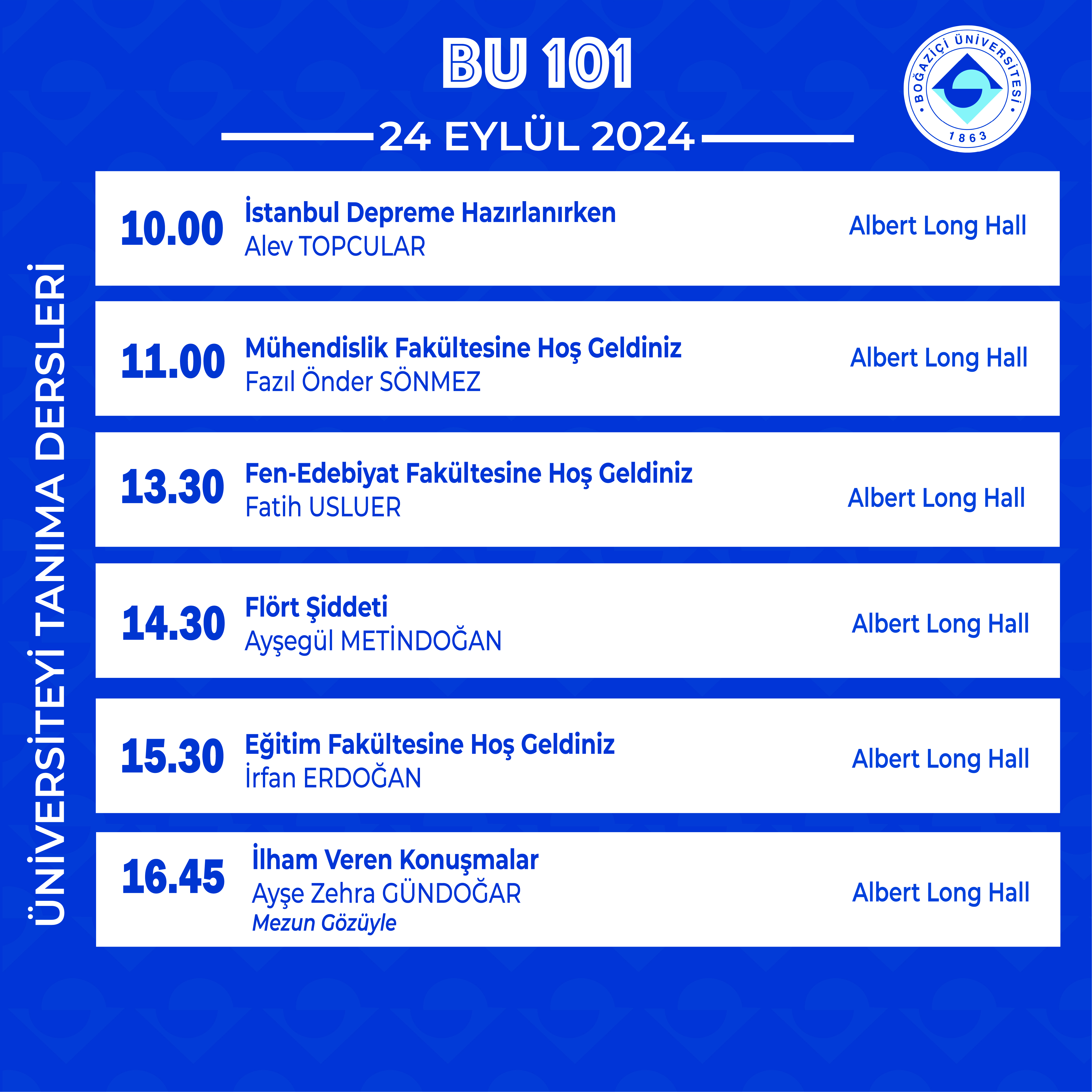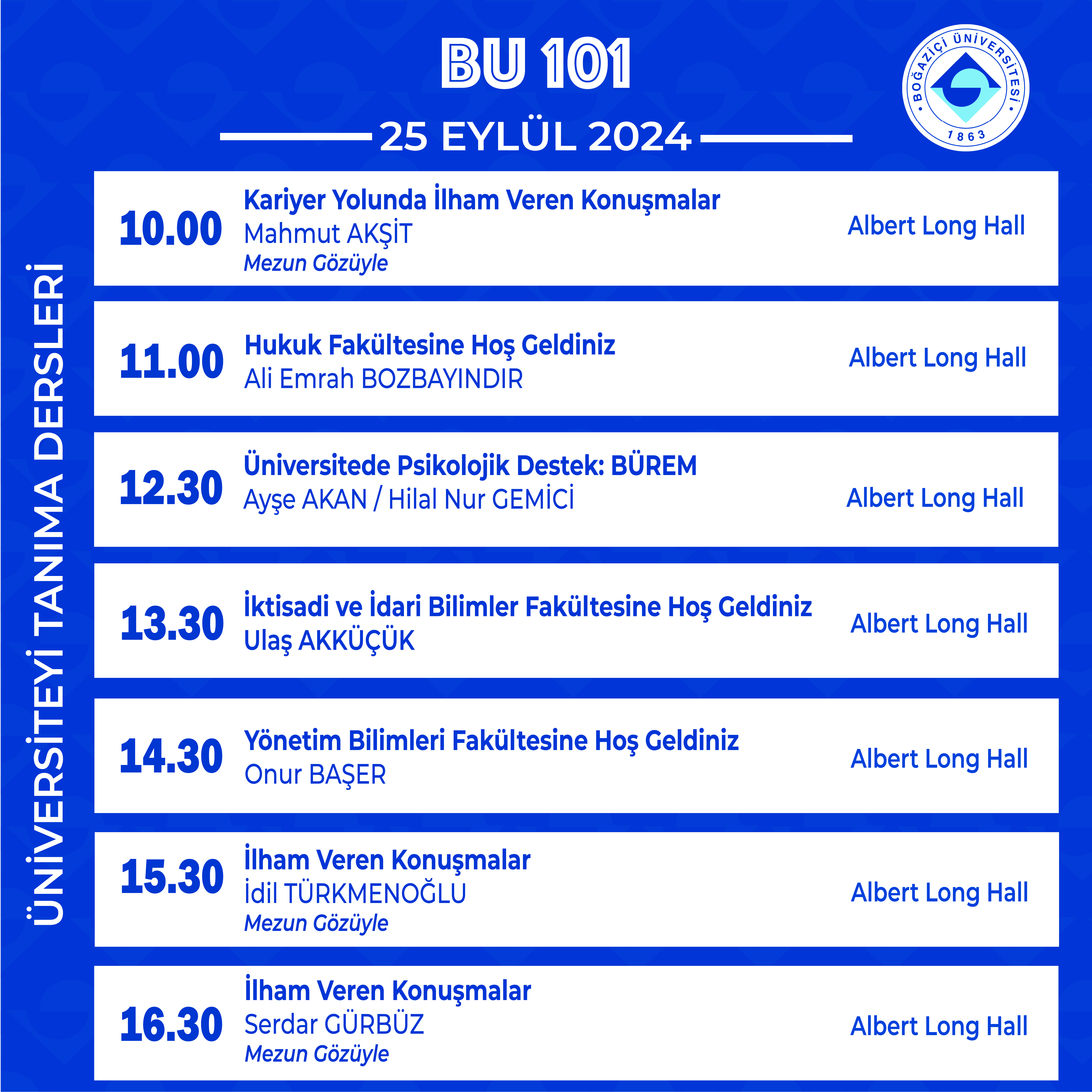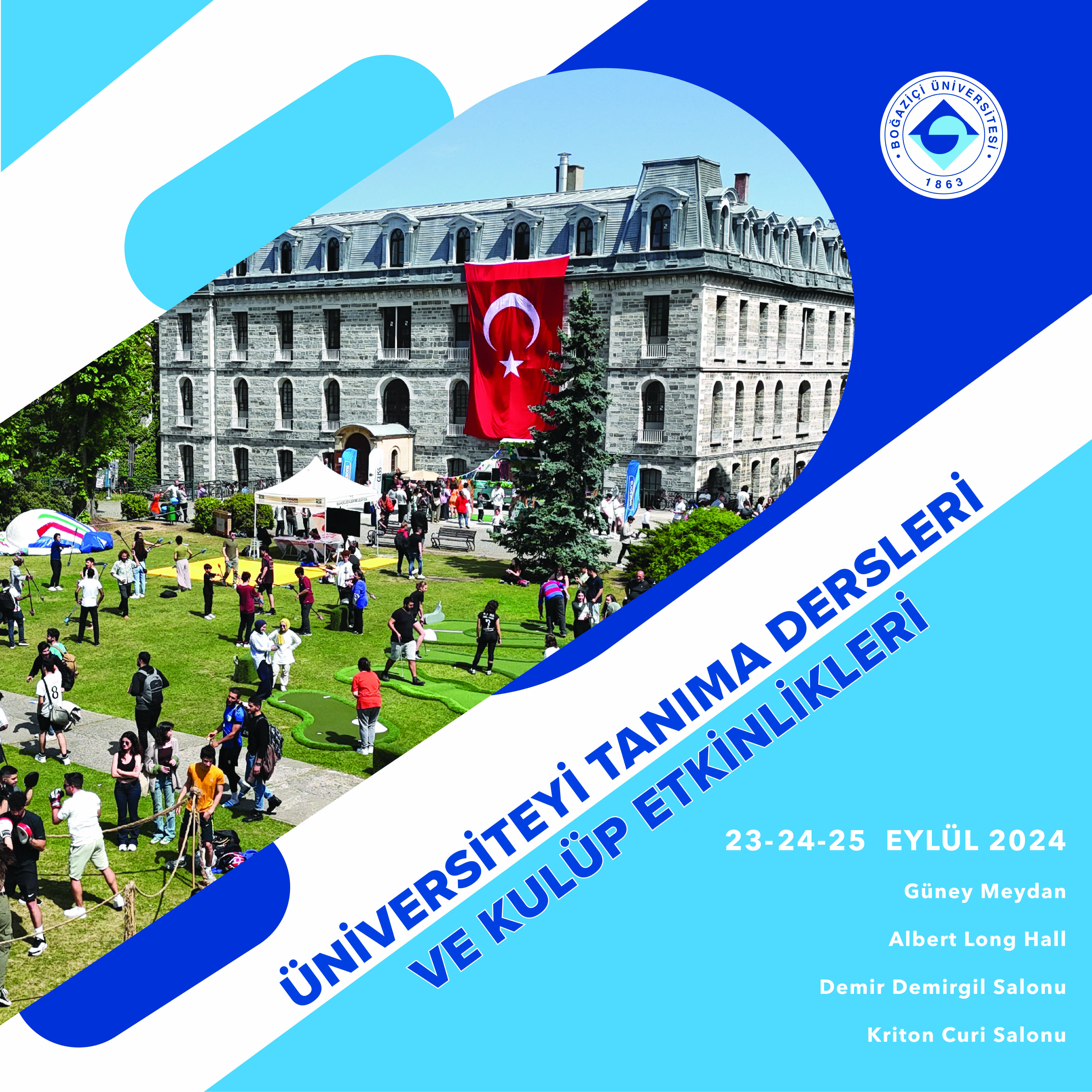 Boğaziçi Üniversitesi ailesine hoş geldiniz! Üniversite hayatınıza adım atarken, sizleri kampüsümüz, akademik süreçler ve öğrenci kulüpleriyle tanıştırmak amacıyla 23-25 Eylül 2024 tarihlerinde düzenlenecek olan Oryantasyon Günleri'ne davet ediyoruz.