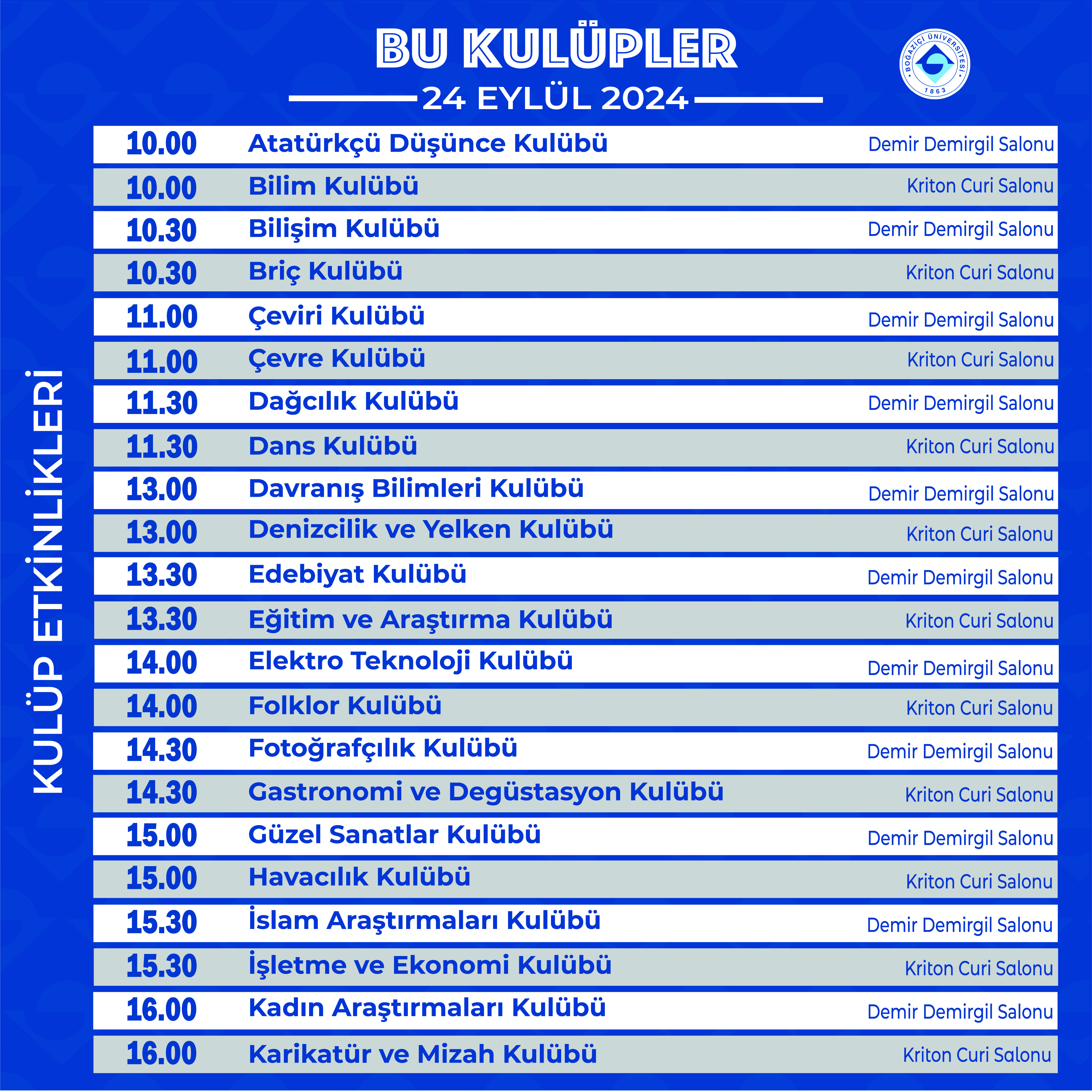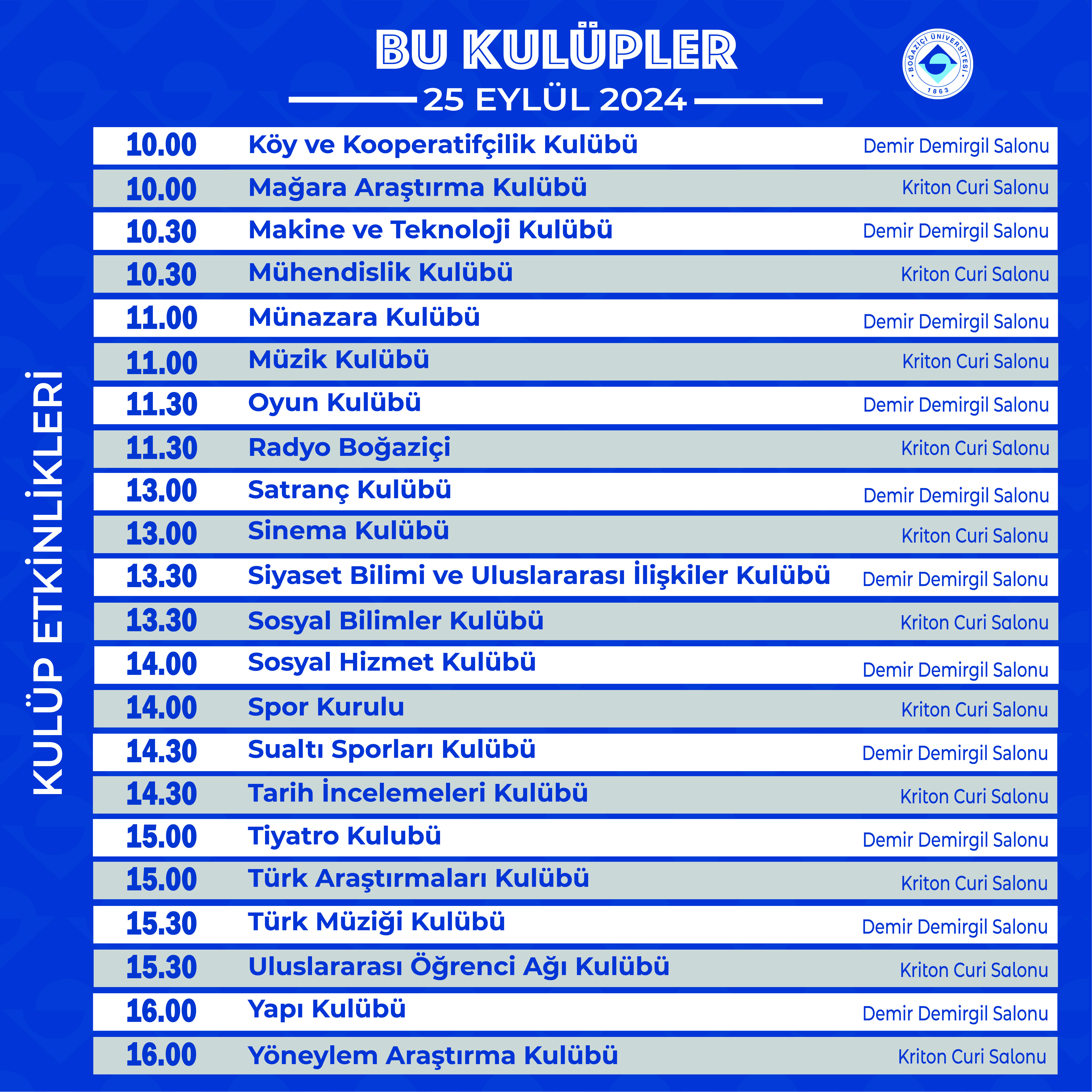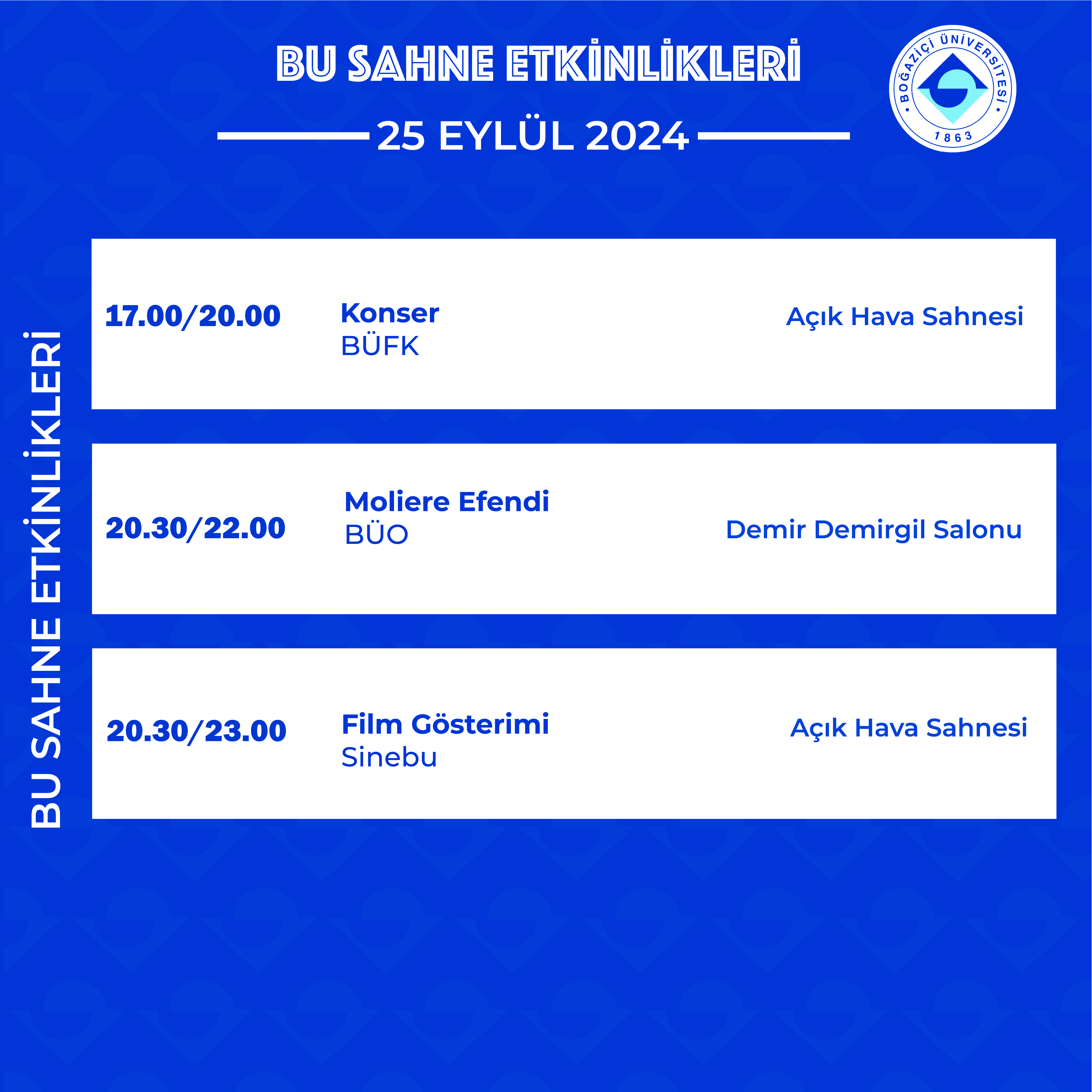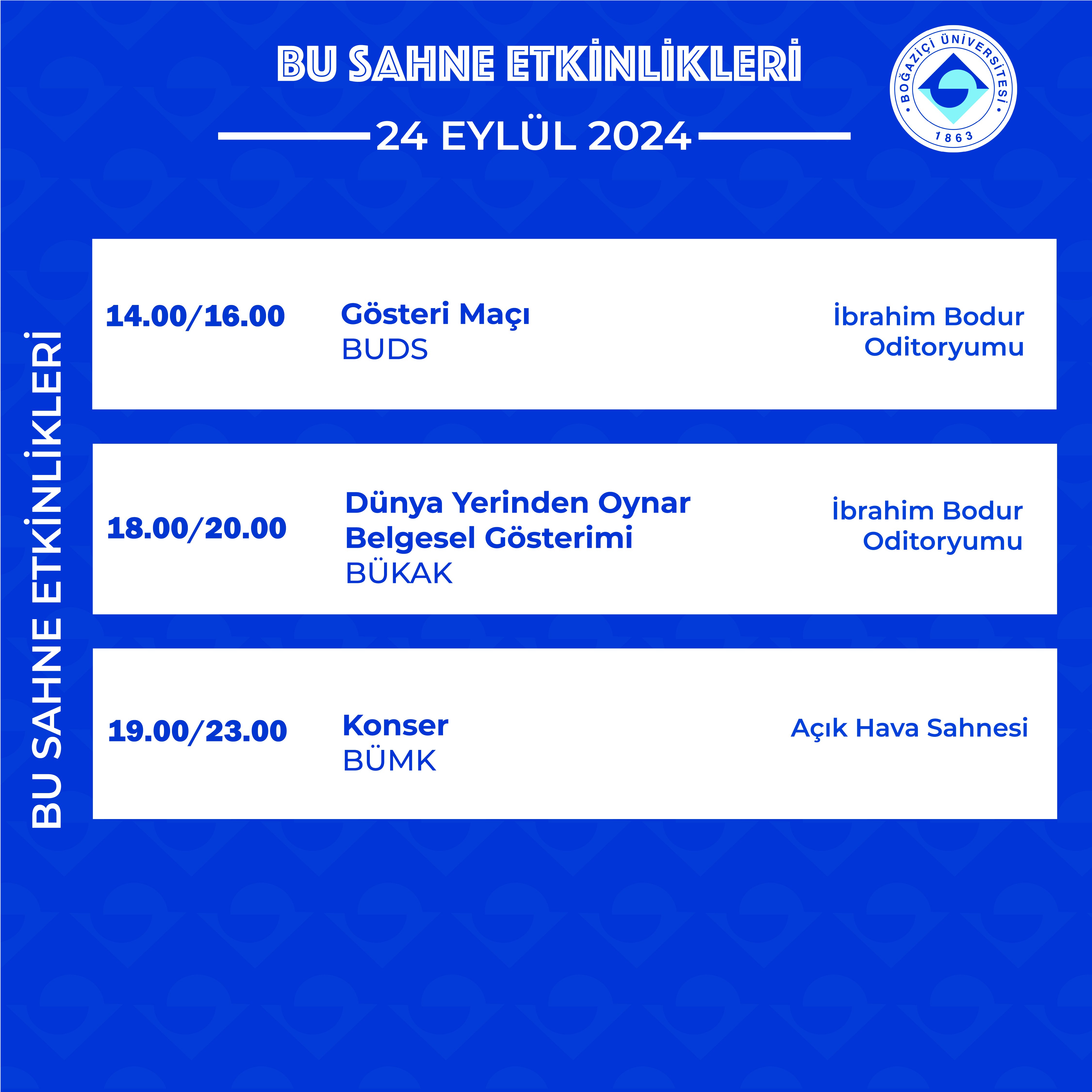 Üç gün boyunca, kampüs turlarından kulüp tanıtımlarına, seminerlerden sosyal etkinliklere kadar dolu dolu bir programla, hem üniversitemizi yakından tanıyacak hem de yeni arkadaşlıklar kurma fırsatı bulacaksınız. Boğaziçi kültürüne hızlı bir giriş yapmanız için bu etkinlikler kaçırılmayacak bir fırsat!