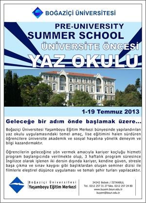 Boğaziçi Üniversitesi Yaşamboyu Eğitim Merkezi (BÜYEM) bünyesinde yapılandırılan yaz okulu uygulamasındaki temel amaç, lise eğitimini halen sürdüren öğrencilerin, üniversiteye giriş öncesinde, üniversite hayatına yönelik tecrübe ve bilgi edinebilmeleridir. Üniversite sınavında yapacakları tercihler ya da ilgi alanları doğrultusunda eğitimlerini sürdürecekleri lisans