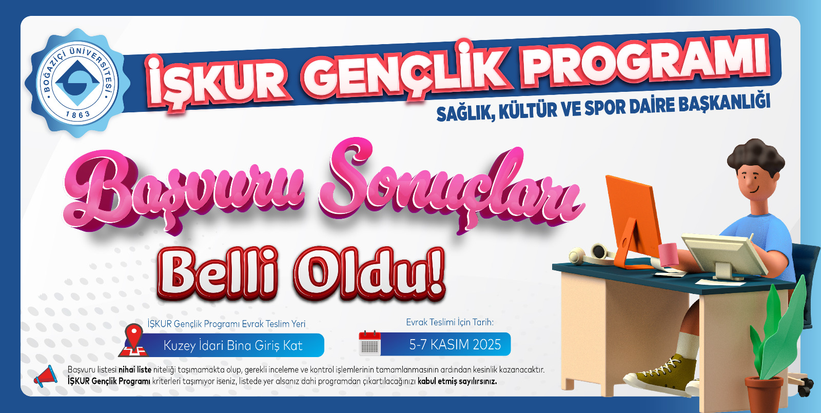 Boğaziçi Üniversitesi İŞKUR Gençlik Programı kapsamında üniversitemize tahsis edilen kontenjan için yapılan başvurular sonucunda, noter huzurunda kura çekimine gerek kalmamış; tüm başvuran öğrencilerimiz programa katılmaya hak kazanmıştır.